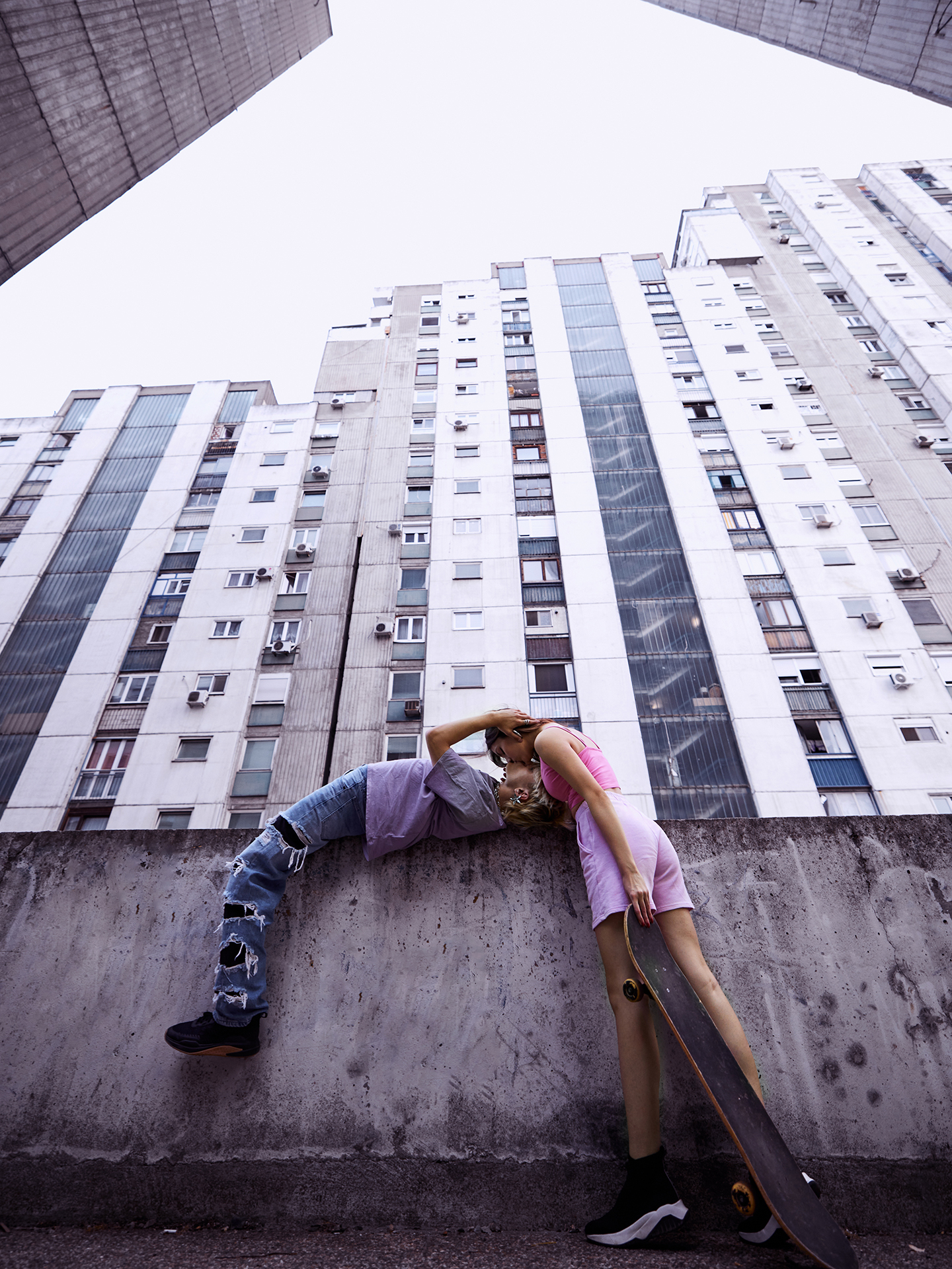 Teenage couple hugs outside in the urban exterior.